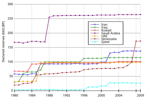 Les pays membres de l’OPEP ont décidé en 1985 de lier leurs quotas de production à leurs réserves. Ce qui paraissait alors sage provoqua une importante hausse des estimations afin d’augmenter leurs droits de production. Cet accroissement leur permit par ailleurs d'obtenir des emprunts plus importants à de meilleurs taux d'intérêt. C'est une raison supposée de l'augmentation des réserves de l'Irak en 1983, alors en guerre avec l’Iran.