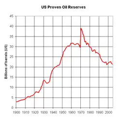 Les réserves pétrolières prouvées des États-Unis ont diminué jusqu'à un peu moins de 21 milliards de barils fin 2008 selon l'Energy Information Administration américaine, une diminution de 46 % par rapport aux 39 milliards de barils qu'elles atteignaient en 1970 lorsque les très grandes réserves de l'Alaska North Slope ('ANS') furent enregistrées. Depuis, il y a eu des millions de puits de pétrole forés aux États-Unis et il ne reste nul endroit où un champ pétrolier de la taille de l'ANS puisse être caché. Il semble donc que les réserves de pétrole des États-Unis soient en baisse durable. Lorsque les champs de pétrole se rapprochent de la fin de leur production, les estimations des quantités restantes deviennent plus précises. En conséquence, les chiffres américains de réserves pétrolières sont très précis comparés à ceux d’autres pays.