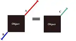 Quand la force A et la force B agissent sur un même objet mais dans des sens opposés (180 degrés entre les deux vecteurs - vecteurs anti-parallèles), la résultante (C) est égale à |A - B|, dans le même sens que la force de plus grande norme.