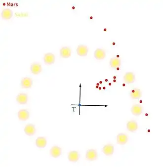 Avec ce modèle simplifié, le Soleil, la Terre et Mars sont alignés une fois par an. Les positions respectives de la Terre et de Mars (mesurées en demi unité astronomique) par rapport au Soleil peuvent être écrites en fonction du temps (mesuré en année terrestre à partir de l'alignement) comme des nombres complexes () :