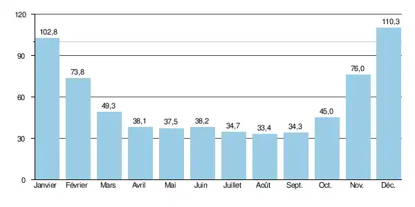 Son débit est assez prédictible en fin d'hiver si l'on connait l'épaisseur des couches de neige dans le bassin supérieur de la rivière. On peut ainsi dès septembre estimer avec une grande précision les débits mensuels de l'année suivante. C'est le cas pour la saison allant d' à . Voici ce que cela donne :