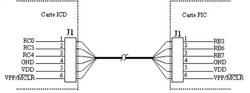 Lorsque l'on relie une carte avec un microcontrôleur PIC avec une carte de débogage ICD, on peut, mais ce n'est pas nécessaire, passer par une liaison utilisant des broches RJ12. On pourrait utiliser d'autres connecteurs, comme DE-9 ou RJ45, ou même un câble plat puisque les distances sont faibles.