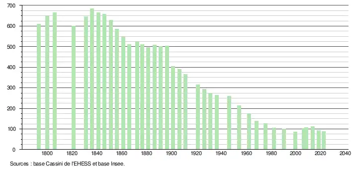 L'évolution du nombre d'habitants est connue à travers les recensements de la population effectués dans la commune depuis 1793. Pour les communes de moins de 10 000 habitants, une enquête de recensement portant sur toute la population est réalisée tous les cinq ans, les populations de référence des années intermédiaires étant quant à elles estimées par interpolation ou extrapolation[29]. Pour la commune, le premier recensement exhaustif entrant dans le cadre du nouveau dispositif a été réalisé en 2008[30].