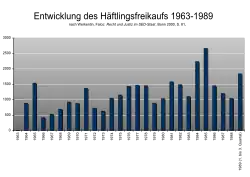 Le rachat de prisonniers est pratiqué jusqu'en 1989, quelque temps avant la chute du mur de Berlin. Il est négocié officieusement au niveau gouvernemental. Après avoir porté initialement sur des cas individuels, le système se perfectionne. Entre 1964 et 1989, 33 755 prisonniers sont rachetés. Le prix par prisonnier est en moyenne d'environ 40 000 marks et passe par la suite à 95 847 marks, et atteindra à la fin jusqu'à 160 000 – 200 000 marks[6]. Officiellement, la somme est évaluée par rapport aux prétendus « dommages » que le prisonnier aurait causé à la RDA (selon la justification semi-officielle) et à la compensation pour la formation ou les études qu'il a suivies (les études étaient gratuites en RDA).