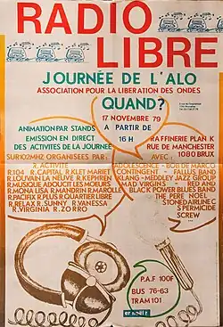 - Fondation de l'Association pour la Libération des Ondes - Belgique (ALO-B)[11] qui fédère les premières radios libres[12]. L'ALO-B est un mélange original d'action directe et de dialogue/négociation avec les autorités[13]. Cette structure souple permet aux radios de se rencontrer, d'organiser l'échange d'informations et de matériel (les « techniciens » fabriqueront rapidement des émetteurs « made in Belgium »). En plus des communiqués de presse, l'ALO-B publie également un bulletin[14], des documents de synthèse[15] et d'analyse[16].