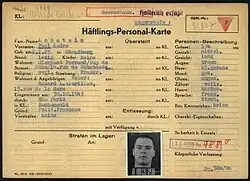 Paul-André Lobstein (2 janvier 1923 á Strasbourg - à Strasbourg 1941), étudiant en médecin à l'université de Strasbourg repliée à Clermont-FerrandCarte personelle de Paul-André Lobstein, produit en octobre 1943 à l'arrivée de Lobstein au camp de concentration de Buchenwald. Original en possession des Arolsen Archives, International Center on Nazi Persecution.En février 1943, il s'engage dans l'Armée secrète de la région de Clermont-Ferrand sous les ordres de son camarade d'études Paul Robert Gandar. Aprés l`arrestation: Caserne du 92e régiment d'infanterie. 26 juin 1943: prison de La Mal Coiffée à Moulins; 18 juillet 1943: Camp de Compiègne; 30 octobre 1943: Camp de concentration de Buchenwald et attribué au Block 26 (Nr.31305)[64]; 22 septembre 1944: Camp de concentration de Mittelbau-Dora, où il est affecté à l'infirmerie (Revier) en Block 39A en tant qu'infirmier. Il y est devenu un témoin important sur les conditions de traitement des détenus atteints de tuberculose en Dora [65],[66],[67],[68]. Le 4 avril il est évacoué dans le dernier convoi qui part du camp de Dora avec 4000 prisonniers à destination du Camp de concentration d'Oranienbourg-Sachsenhausen. La colonne est arrivée au «Jugendschutzlager» du camp de concentration de Ravensbrück le 14 avril, parce que le camp de Sachsenhausen était surpeuplé. Le , les SS ont également fait évacuer ce camp. De la une Marche de la mort en direction de Schwerin a été lancée. Le , les survivants qui avaient quitté le camp de concentration de Mittelbau Dora près d'un mois ont été libérés par l'Armée rouge dans la région de Parchim.