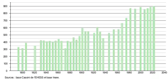 L'évolution du nombre d'habitants est connue à travers les recensements de la population effectués dans la commune depuis 1793. Pour les communes de moins de 10 000 habitants, une enquête de recensement portant sur toute la population est réalisée tous les cinq ans, les populations de référence des années intermédiaires étant quant à elles estimées par interpolation ou extrapolation[24]. Pour la commune, le premier recensement exhaustif entrant dans le cadre du nouveau dispositif a été réalisé en 2006[25].