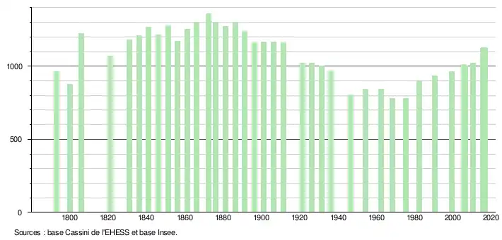 L'évolution du nombre d'habitants est connue à travers les recensements de la population effectués dans la commune depuis 1793. Pour les communes de moins de 10 000 habitants, une enquête de recensement portant sur toute la population est réalisée tous les cinq ans, les populations de référence des années intermédiaires étant quant à elles estimées par interpolation ou extrapolation[4]. Pour la commune, le premier recensement exhaustif entrant dans le cadre du nouveau dispositif a été réalisé en 2005[5].
