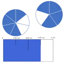 Il y a donc 568 = 7 fois plus de pommes que de bananes, la fraction 568 permettant de calculer l’importance du déséquilibre exprimé par le rapport, qui pourrait s’écrire également pommes/bananes = 7:1 ou simplement pommes/bananes = 7 (d’où des confusions possibles, liées aux notations parfois similaires entre fraction et rapport, car ici il y a bien 7 fois plus de pommes que de bananes, et non l’inverse comme l’indiquerait la notation 568).