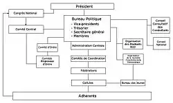 Enfin, existent les sections de l'étranger, qui peuvent s'organiser sous la direction des bureaux de coordination, mais restent de facto liés directement au bureau national.