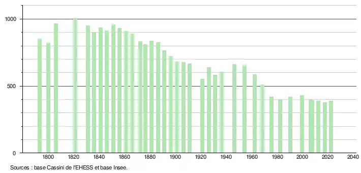 L'évolution du nombre d'habitants est connue à travers les recensements de la population effectués dans la commune depuis 1793. Pour les communes de moins de 10 000 habitants, une enquête de recensement portant sur toute la population est réalisée tous les cinq ans, les populations de référence des années intermédiaires étant quant à elles estimées par interpolation ou extrapolation[37]. Pour la commune, le premier recensement exhaustif entrant dans le cadre du nouveau dispositif a été réalisé en 2007[38].