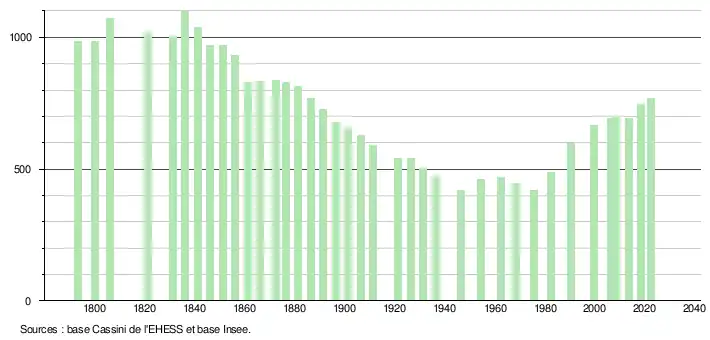 L'évolution du nombre d'habitants est connue à travers les recensements de la population effectués dans la commune depuis 1793. Pour les communes de moins de 10 000 habitants, une enquête de recensement portant sur toute la population est réalisée tous les cinq ans, les populations de référence des années intermédiaires étant quant à elles estimées par interpolation ou extrapolation[23]. Pour la commune, le premier recensement exhaustif entrant dans le cadre du nouveau dispositif a été réalisé en 2008[24].