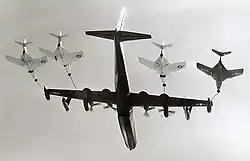 Le Boeing KC-135 Stratotanker, premier avion à réaction dédié au ravitaillement en vol, est développé en parallèle avec le Boeing 707 avec qui il partage nombre d'éléments, même si le fuselage du 707 est plus large. Cet avion entre en service en 1957 et constitue, depuis cette date, un élément-clé de la capacité de projection à longue distance de l'US Air Force. Plus de 700 exemplaires sont construits. Une grande partie sont, dans les années 1980, remotorisés avec des réacteurs plus modernes, augmentant considérablement leur capacité. Outre l'US Air Force, l'Armée de l'air française achète aussi cet avion (14 exemplaires). Le Chili, Singapour et la Turquie achètent ensuite des avions américains d'occasion. Dans les années 2020, le KC-135 est en cours de retrait progressif de l'USAF[54]. Des Boeing 707 construits pour le marché civil sont transformés en avions ravitailleurs, dans une configuration similaire à celle du KC-135, mais s'en distinguent par le diamètre supérieur du fuselage et la présence de hublots. En 2024, des Boeing 707 ravitailleurs sont encore utilisés par l'armée de l'air israélienne (mais leur remplacement est prévu[55]) et par la société militaire privée Omega Aerial Refueling Services[56]. Les armées de l'air italienne et espagnole ont disposé de tels avions, mais ils ont été remplacés[57].
