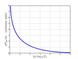 Le spectre de puissance du Bremsstrahlung décroît rapidement de l'infini (lorsque ) à zéro (lorsque ). Ce tracé est valide pour le cas quantique eV et la constante K = 3,17.