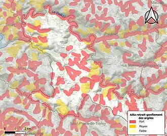 La commune est vulnérable au risque de mouvements de terrains constitué principalement du retrait-gonflement des sols argileux[23]. Cet aléa est susceptible d'engendrer des dommages importants aux bâtiments en cas d’alternance de périodes de sécheresse et de pluie. 45,8 % de la superficie communale est en aléa moyen ou fort (76,3 % au niveau départemental et 48,5 % au niveau national). Sur les 151 bâtiments dénombrés sur la commune en 2019, 41 sont en aléa moyen ou fort, soit 27 %, à comparer aux 90 % au niveau départemental et 54 % au niveau national. Une cartographie de l'exposition du territoire national au retrait gonflement des sols argileux est disponible sur le site du BRGM[24],[Carte 3].