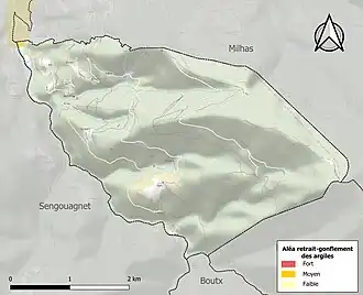Le retrait-gonflement des sols argileux est susceptible d'engendrer des dommages importants aux bâtiments en cas d’alternance de périodes de sécheresse et de pluie. 0,1 % de la superficie communale est en aléa moyen ou fort (88,8 % au niveau départemental et 48,5 % au niveau national). Sur les 101 bâtiments dénombrés sur la commune en 2019, 1 sont en aléa moyen ou fort, soit 1 %, à comparer aux 98 % au niveau départemental et 54 % au niveau national. Une cartographie de l'exposition du territoire national au retrait gonflement des sols argileux est disponible sur le site du BRGM[26],[Carte 3].
