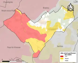 Le retrait-gonflement des sols argileux est susceptible d'engendrer des dommages importants aux bâtiments en cas d’alternance de périodes de sécheresse et de pluie. 71,6 % de la superficie communale est en aléa moyen ou fort (90,2 % au niveau départemental et 48,5 % au niveau national). Sur les 139 bâtiments dénombrés sur la commune en 2019, 127 sont en aléa moyen ou fort, soit 91 %, à comparer aux 91 % au niveau départemental et 54 % au niveau national. Une cartographie de l'exposition du territoire national au retrait gonflement des sols argileux est disponible sur le site du BRGM[21],[22].