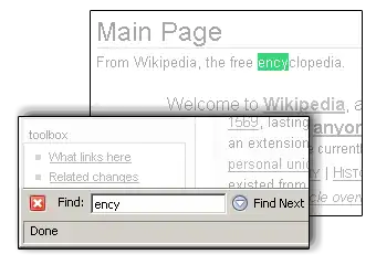 Exemple d'une recherche progressive avec Mozilla Firefox. Lorsque l'utilisateur a tapé « ency », comme cette chaîne de caractères est présente dans le texte, la première occurrence de la chaîne est surlignée en vert.