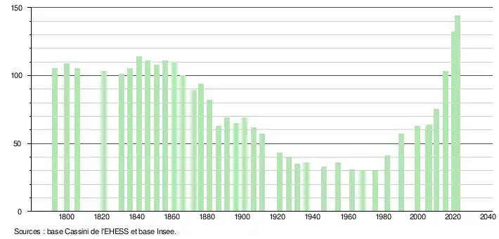 L'évolution du nombre d'habitants est connue à travers les recensements de la population effectués dans la commune depuis 1793. Pour les communes de moins de 10 000 habitants, une enquête de recensement portant sur toute la population est réalisée tous les cinq ans, les populations de référence des années intermédiaires étant quant à elles estimées par interpolation ou extrapolation[13]. Pour la commune, le premier recensement exhaustif entrant dans le cadre du nouveau dispositif a été réalisé en 2005[14].