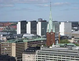 La ville de Stockholm acquiert dès les années 1930 un certain nombre de terrains en préparation d'un prolongement de la rue Sveavägen jusqu'à la rue Hamngatan. Une loi spéciale, la Lex Norrmalm, est promulguée en 1953 afin de faciliter les expropriations dans le cadre de projets de redéveloppement[42]. Cette loi, à laquelle on reproche de contribuer au délabrement du parc immobilier (propriétaires et constructeurs rechignant à investir sous la menace d'une expropriation), sera finalement abrogée en 1979, après que la Cour de justice de l'Union européenne a donné raison à deux propriétaires fonciers qui s'estimaient lésés.
