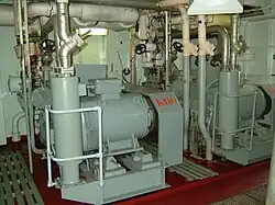 Une installation typique comprend trois à cinq compresseurs installés dans une salle réservée à cet effet. Dans le cas d'un refroidissement indirect, on trouve une salle à saumure contenant l'échangeur de chaleur, les pompes et tuyauteries associées. Les compresseurs sont du type à vis sur les grands navires, et alternatifs (à pistons) sur les petits. Les systèmes modernes sont entièrement automatisés et contrôlés par ordinateur. Des capteurs vérifiant les pressions et températures, des automatismes se chargeant de réguler la quantité de liquide réfrigérant distribuée ainsi que la puissance développée par les compresseurs.