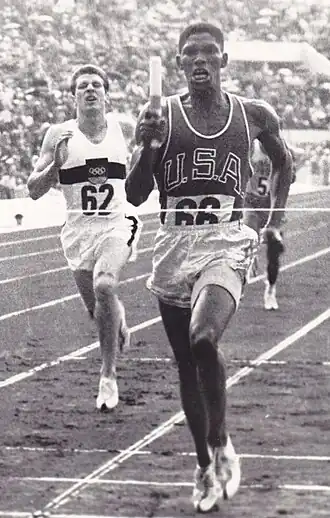 Le relais 4 × 400 mètres des Jeux olympiques de 1968, à Mexico, est remporté par les États-Unis qui aligne en finale les trois médaillés du 400 m, Lee Evans, Larry James et Ron Freeman, plus Vincent Matthews. Le relais américain établit un nouveau record du monde en 2 min 56 s 16, améliorant de près de trois secondes l'ancienne meilleure marque mondiale. Le Kenya (Daniel Rudisha, Hezahiah Nyamau, Naftali Bon et Charles Asati) s'adjuge la médaille d'argent en 2 min 59 s 6 et la République fédérale d'Allemagne (Helmar Müller, Manfred Kinder, Gerhard Hennige et Martin Jellinghaus) la médaille de bronze en 3 h 0 min 5 s[15]. La veille, lors des séries, les américains avaient égalé le record olympique en 3 min 0 s 7.