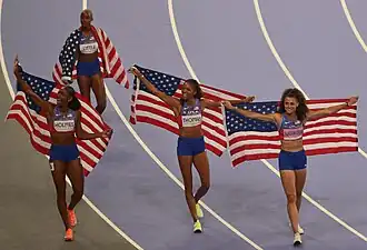 - ↑ L'équipe de Russie, initialement deuxième de l'épreuve, est disqualifiée en 2017 à cause du dopage d'Antonina Krivoshapka. La Jamaïque récupère la médaille d'argent et l'Ukraine la médaille de bronze.