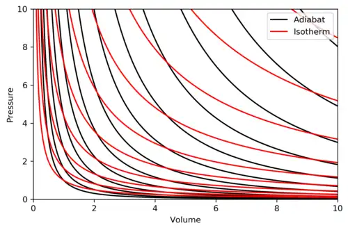 Le volume est porté en abscisse (axe horizontal), la pression est portée en ordonnée (axe vertical). Les courbes isentropes sont représentées en noir, les courbes isothermes en rouge.