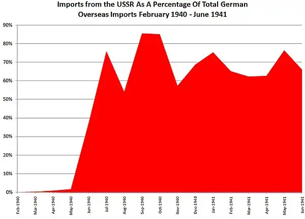 Le , l'accord germano-soviétique prévoyait l'échange de 650 millions de matières premières contre le même montant de produits manufacturés[99],[100]. L'accord commercial aida l'Allemagne à surmonter le blocus britannique[76]. L'accord prévoyait qu'un million de tonnes de céréales, 900 000 tonnes de pétrole et plus de 500 000 tonnes de minerais divers (principalement du minerai de fer) seraient échangés contre des usines d'essence synthétique, des navires, des machines-outils et du charbon[99]. L'accord contenait également un protocole secret permettant à l'Union soviétique d'acquérir des ressources d'autres pays au nom de l'Allemagne[101].