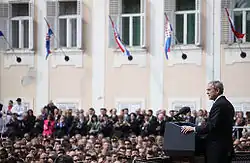 Le 4 avril 2008, le président américain George W. Bush arrive à Zagreb pour une visite d'État officielle de deux jours. La visite est immédiatement suivie du sommet de Bucarest 2008 des pays de l'OTAN, au cours duquel la Croatie et l'Albanie sont invitées à rejoindre l'alliance. Bush rencontre le président croate Stipe Mesić et le Premier ministre Ivo Sanader, et prononce un discours sur la place Saint-Marc de Zagreb (en), dans le centre de la ville. Des rassemblements pacifiques ont lieu pendant la visite pour protester contre la politique étrangère des États-Unis et l'adhésion imminente de la Croatie à l'OTAN[16],[17].