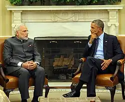 Lors du second tour des élections générales indiennes de 2014, un scepticisme généralisé s'est manifesté quant à l'avenir de la relation stratégique entre l'Inde et les États-Unis. Narendra Modi, dont le visa américain avait été révoqué alors qu'il était ministre en chef du Gujarat, avait été boycotté par les responsables américains pendant près d'une décennie pour son rôle présumé dans les émeutes de 2002 au Gujarat[138],[172]. Cependant, sentant la victoire inévitable de Modi bien avant l'élection, l'ambassadrice américaine Nancy Powell (en) lui avait tendu la main. De plus, après son élection au poste de Premier ministre de l'Inde en 2014, le président Obama l'a félicité par téléphone et l'a invité à se rendre aux États-Unis[173],[174]. Le secrétaire d'État américain John Kerry s'est rendu à New Delhi le pour préparer la toute première visite de M. Modi en tant que Premier ministre. En , quelques jours avant sa visite aux États-Unis, dans une interview à l'émission Fareed Zakaria sur CNN, M. Modi a déclaré que « l'Inde et les États-Unis sont liés par l'histoire et la culture », mais a reconnu qu'il y a eu des « hauts et des bas » dans les relations[175]. M. Modi s'est rendu aux États-Unis du 27 au [176], en commençant par son discours inaugural à l'Assemblée générale des Nations unies, suivi d'une réception publique de gala donnée par la communauté indienne américaine au Madison Square Garden de New York, avant de se rendre à Washington pour l'entretien bilatéral avec Obama. Au cours de son séjour, M. Modi a également rencontré plusieurs chefs d'entreprise américains et les a invités à se joindre à son ambitieux programme Make in India (en), qui vise à faire de l'Inde un centre de fabrication[177],[178],[179].