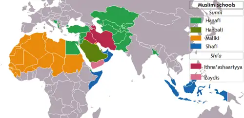 Le chiisme (ou chî`isme[12]), constitue l'une des trois principales branches de l’islam avec le sunnisme et le kharidjisme ; il regroupe environ 10 à 15 % des musulmans, dont 90 % d'Iraniens. Les chiites sont souvent appelés péjorativement râfidhites[13] dans les textes du Moyen Âge.