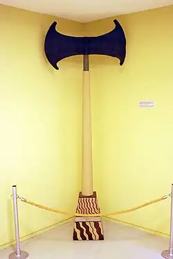 Le symbole de la double hache possède une grande importance. La double hache dérive de celle utilisée au quotidien, tout en comportant des particularités[29]. De nombreuses haches ont été retrouvées, mais certaines ne sont pas conçues à des fins pratiques, soit parce qu'elles sont faites de matériaux fragiles (pierres tendres ou plomb) ou parce que leur taille les rend inutilisables, certaines si petites que leur manche est à peine plus gros qu'une épingle[30]. Même au niveau de la forme, on note des différences. La lame est plus large et moins épaisse, le côté tranchant s'épanouissant en demi-cercles, avec parfois des lames redoublées, la hache devenant ainsi non plus double mais quadruple[29]. La hache sacrée est plus ornementée, rendant son utilisation quasiment impossible. Sa surface est parfois décorée de motifs linéaires suivant les bords de la hache, tandis que des lignes obliques remplissent l'espace central ainsi dessiné[30].