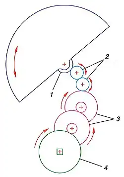 Les trois premiers éléments permettent d'entraîner le rouage réducteur dans un sens. Le dernier élément retient le rouage s'il n'est pas entraîné afin que le ressort de barillet ne se désarme pas.