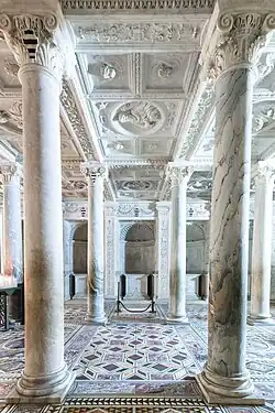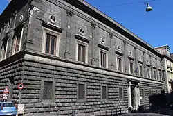 Le palais, qui à l’origine était bâti en en C, dispose d'une cour soutenue par des arcades d’ordre toscan, doublée en contre-façade par un second ordre d’arcades, cette fois aveugles, d’ordre composite et entrecoupées de fenêtres en piperno et de niches en marbre blanc. Les façades, tant latérales que principales, présentent une cloison horizontale délimitée par un entablement continu en marbre. Le rez-de-chaussée est recouvert d'un parement en piperno, brisé par les cadres de fenêtres ensoleillées, un héritage des compositions de façades typiques du XVe siècle.