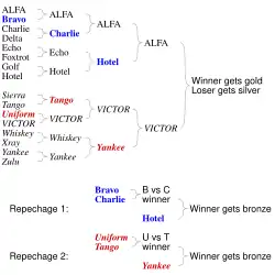 Ici les concurrents éliminés par ALFA s'affrontent d'un côté pour une médaille de bronze et les concurrents éliminés par VICTOR s'affrontent de l'autre pour une seconde médaille de bronze[1].