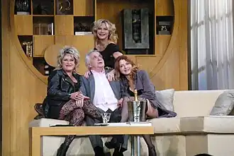Une partie des comédiens lors des saluts, le 13 novembre 2015 : Laurent Spielvogel, Marie-Anne Chazel, Michel Sardou, Emma Gamet et Valérie Vogt | |