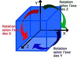 On reconnait trois rotations laissant invariant le cube, la première suivant l'axe des x, la deuxième suivant l'axe des y et la troisième suivant celui des z. La figure de gauche illustre l'interprétation géométrique de ces trois rotations : l'image de (1324) est celle représentée par la flèche rouge, celle de (1234) par la bleue et celle de (1342) par la verte.