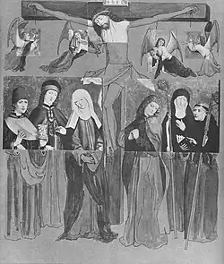 Le retable est de taille importante : l'Annonciation, qui ne couvre que le quart de l'un des deux panneaux, mesure 98,7 × 70,5 cm, ce qui fait, pour le panneau entier, environ 200 × 140 cm. Le retable - tel que l'on peut l'imaginer par les morceaux que l'on connaît - n'a pas deux ailes rabattables comme habituellement, par exemple sur le retable de l’église de Lünen, mais au contraire présente les tableaux alignés les uns à côté des autres. Dans le centre, une Crucifixion, dont l'historien d'art Paul Pieper (de) propose la reconstruction suivante[3] : D'un côté de la croix Marie, avec les saints Côme et Damien, et de l’autre l'apôtre Jean, sainte Scolastique et saint Benoît. Quatre anges recueillent le sang qui goutte des blessures. La tête du Christ est préservée, comme les bustes des saints, divers anges avec des calices en or. Le panneau a été découpé, et n'ont été gardés que la tête du Christ, les quatre anges, et les deux groupes de trois personnes, réduits aux bustes. La tête et les groupes de personnes sont à la National Gallery de Londres, les quatre têtes d'anges sont conservés au LWL-Landesmuseum de Münster.