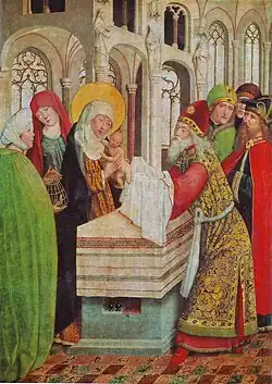 Sur un panneau latéral, quatre scènes de l'histoire sainte sont peintes sur les panneaux latéraux : un panneau représente l'Annonciation, entièrement conservé et à la National Gallery, un deuxième la Nativité dont il ne reste que les cinq beaux anges, et la tête de Joseph, au Landesmuseum à Münster. De l'Adoration des mages ne subsistent que les rois. Le fragment montrant l'enfant et un roi est à la National Gallery, les têtes des deux autres rois sont au LWL- Landesmuseum à Münster. La Présentation de Jésus au Temple est complète et est à la National Gallery. Deux panneaux latéraux du retable sont attribués à Jan Baegert.