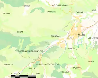 Les communes les plus proches[Note 1] sont[3] : Codalet (1,4 km), Prades (2,1 km), Catllar (3,4 km), Villefranche-de-Conflent (3,5 km), Conat (3,6 km), Taurinya (3,8 km), Clara (4,4 km), Corneilla-de-Conflent (4,9 km).