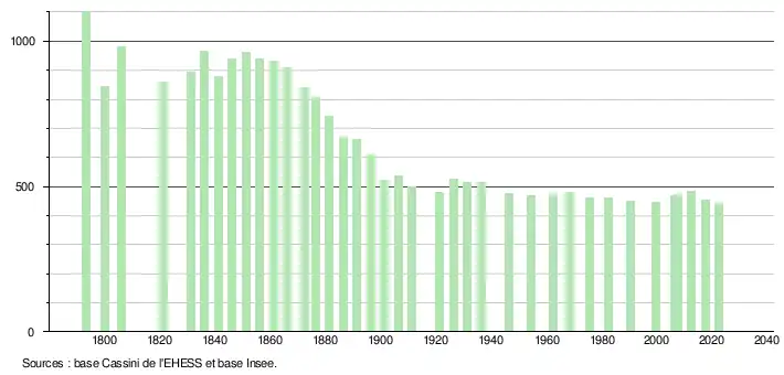 L'évolution du nombre d'habitants est connue à travers les recensements de la population effectués dans la commune depuis 1793. Pour les communes de moins de 10 000 habitants, une enquête de recensement portant sur toute la population est réalisée tous les cinq ans, les populations de référence des années intermédiaires étant quant à elles estimées par interpolation ou extrapolation[28]. Pour la commune, le premier recensement exhaustif entrant dans le cadre du nouveau dispositif a été réalisé en 2007[29].
