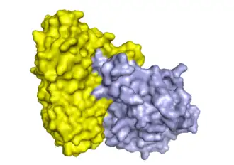 Structure de la ricine. La chaîne A est représentée en bleu et la chaîne B en orange. (PDB 2AAI[1]) | ||
