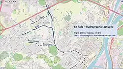 En aval de Bériwa, après le Moulin Nozé, le Rida se séparait en deux. Le cours principal était dévié par l'endroit actuel de la rue Laixheau et s'écoulait en direction de la Place Licour. En cas de grosses eaux une partie du débit passait dans le cours d'origine, par la Rue Faurieux[23], où la voûte de son passage en-dessous d'une ancienne ligne de chemin de fer est encore visible.