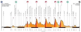 L'épreuve débute et s'achève à Londres, dans The Mall, près du palais de Buckingham. Le parcours s'étend sur 140 kilomètres. À la suite du départ londonien, les coureurs disputent un parcours de 140,3 kilomètres entre la ville de Londres et le comté de Surrey. La course comporte deux difficultés dont la dernière se situe à 49 kilomètres de l'arrivée[1].