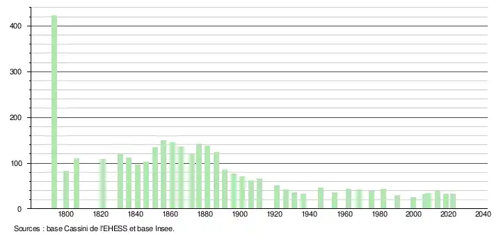 L'évolution du nombre d'habitants est connue à travers les recensements de la population effectués dans la commune depuis 1793. Pour les communes de moins de 10 000 habitants, une enquête de recensement portant sur toute la population est réalisée tous les cinq ans, les populations de référence des années intermédiaires étant quant à elles estimées par interpolation ou extrapolation[23]. Pour la commune, le premier recensement exhaustif entrant dans le cadre du nouveau dispositif a été réalisé en 2008[24].