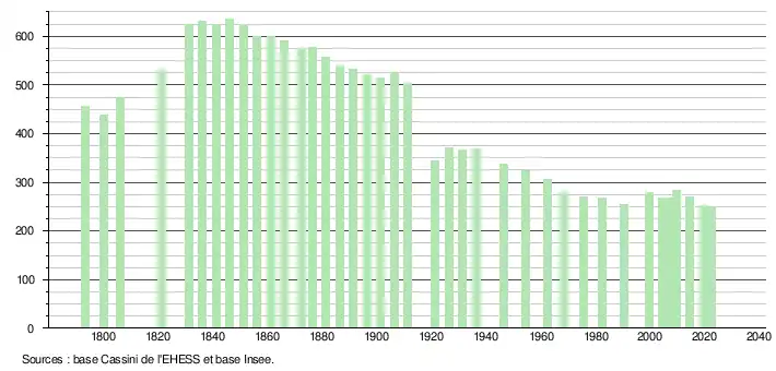 L'évolution du nombre d'habitants est connue à travers les recensements de la population effectués dans la commune depuis 1793. Pour les communes de moins de 10 000 habitants, une enquête de recensement portant sur toute la population est réalisée tous les cinq ans, les populations de référence des années intermédiaires étant quant à elles estimées par interpolation ou extrapolation[29]. Pour la commune, le premier recensement exhaustif entrant dans le cadre du nouveau dispositif a été réalisé en 2004[30].