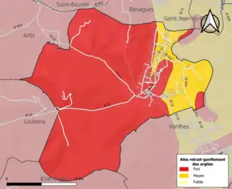 Les mouvements de terrains susceptibles de se produire sur la commune sont soit des glissements de terrains, soit des effondrements liés à des cavités souterraines, soit des mouvements liés au retrait-gonflement des argiles. Près de 50 % de la superficie du département est concernée par l'aléa retrait-gonflement des argiles, dont la commune de Rieux-de-Pelleport[43]. L'inventaire national des cavités souterraines permet par ailleurs de localiser celles situées sur la commune[44].
