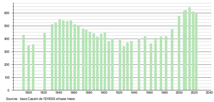 L'évolution du nombre d'habitants est connue à travers les recensements de la population effectués dans la commune depuis 1793. Pour les communes de moins de 10 000 habitants, une enquête de recensement portant sur toute la population est réalisée tous les cinq ans, les populations de référence des années intermédiaires étant quant à elles estimées par interpolation ou extrapolation[30]. Pour la commune, le premier recensement exhaustif entrant dans le cadre du nouveau dispositif a été réalisé en 2008[31].