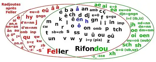 Son système orthographique propre se caractérise par l'introduction de graphèmes spécialement conçus pour qu'un même phonème puisse être prononcé conformément à la prononciation de chaque région. Il s'oppose à l'ancienne norme, appelée système Feller.